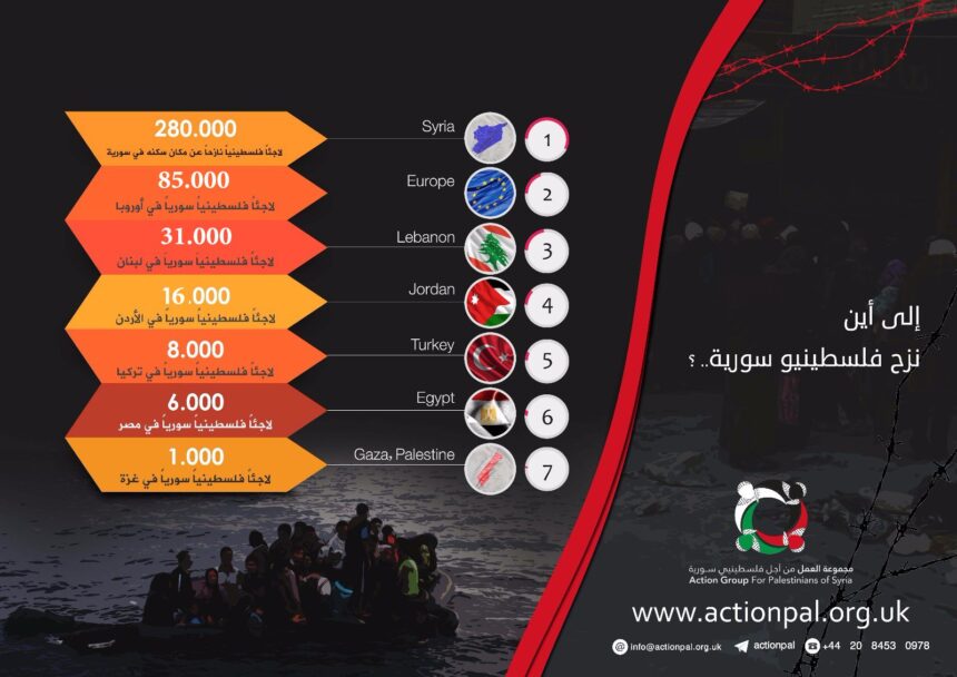 وأشار قسم الدراسات في مجموعة العمل إلى أن أكثر من (150) ألف لاجئ فلسطيني هاجر خارج سورية من أصل (650) ألف كانوا يعيشون بداخلها  قبل اندلاع الحرب فيها، وحوالي (410) آلاف بقوا داخل سورية، وأكثر من 60% من الفلسطينيين في سورية نزحوا لمرة واحدة على الأقل.