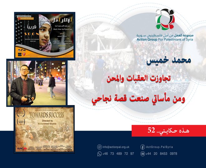 اللاجئ الفلسطيني السوري محمد خميس نشأ وترعرع في مخيم خان الشيح للاجئين الفلسطينيين بريف دمشق، ولم يكن يفكر يوماً بمغادرته، لكن ظروف الحرب وما تعرض له مخيمه من قصف واشتباكات اضطرته هو وعائلته لأن يغادره إلى لبنان التي ذاق ضنك الحياة وتجرع الحنظل فيها، ما دفعه ذلك للمخاطرة بحياته وركوب قوارب الموت بحثاً عن حياة أفضل تحقق له الاستقرار والطموح والحلم الذي راوده منذ صغره في أن يصبح مخرجاً ويوثق معاناة أبناء شعبه.