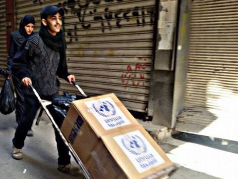 استمرار توزيع المساعدات الغذائية لليوم الثالث على التوالي في مخيم اليرموك المحاصر