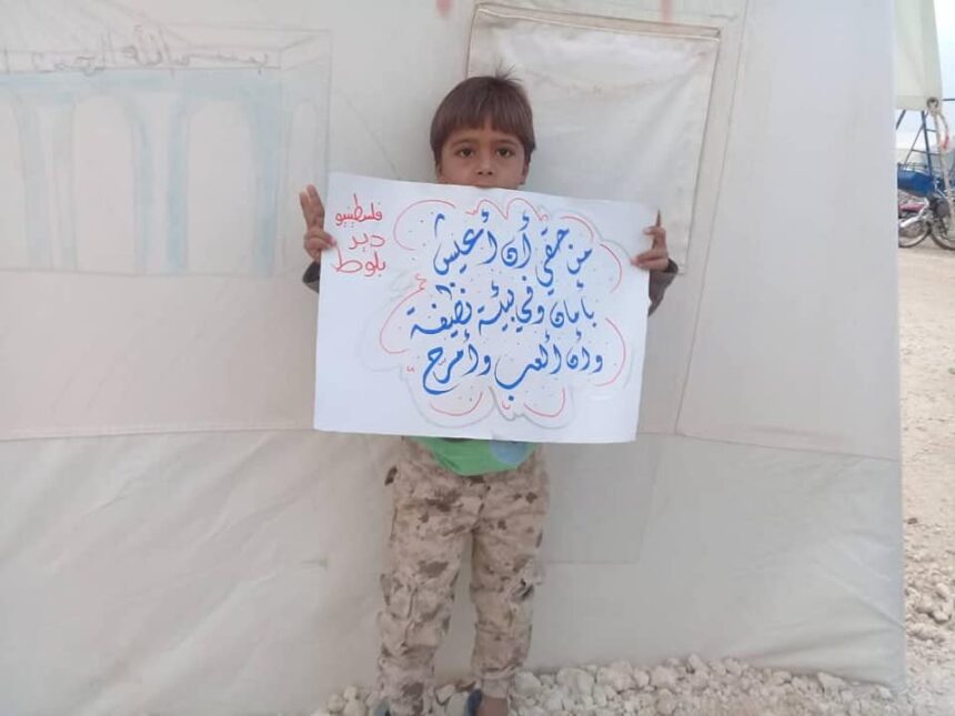 بمناسبة يوم الطفولة العالمي ناشد الأطفال الفلسطينيين المهجرين قسراً مع عائلتهم إلى مخيم دير بلوط بمنطقة عفرين شمال سورية الأمم المتحدة والمنظمات الدولية وحقوق الإنسان ووكالة الأونروا والضمائر الإنسانية من أجل تحسين ظروفهم المعيشية والتعليمية والاقتصادية، والعمل على إنهاء محنتهم وعذباتهم.
