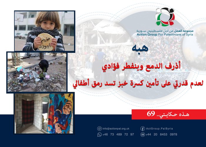 تتابع هبة سرد حكايتها كان حالي كحال بقية الناس الذين قضَ مضجعهم الجوع وجعلهم يتلون من الألم على فلذات أكبادهم وهم يرونهم يذوون أمامهم من قلة الطعام، في ليلة حزمت أمري وخاطرت بنفسي وقررت أن أفتش حاويات المخيم علني أجد ما يسد رمق أولادي، فبحثت في القمامة حتى وجدت بعض الخبز المعفن فكانت فرحتي لا توصف هرعت إلى المنزل وأنا أحمد ربي على ما رزقني، إلا أن أولادي لم يقبلوا أن يأكلوها هنا صرخت بعلو صوتي فيهم وقلت لهم أحمدوا الله على هذا الطعام الذي يبقينا على قيد الحياة”.