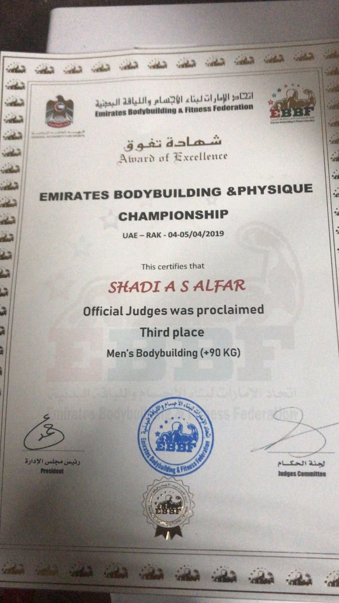 أحرز الشاب الفلسطيني السوري شادي أحمد المركز الثالث في بطولة الإمارات لكمال الأجسام والفيزيك في وزن فوق 90 كغم التي نظمها اتحاد الإمارات لكمال الأجسام واللياقة البدنية يوم الخميس 4/4 في إمارة رأس الخيمة، وهو من أبناء مخيم اليرموك.
