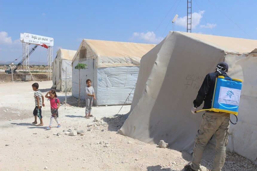 وقام فريق ملهم التطوعي خلال الأيام الماضية برشّ المخيم بالمبيدات الحشرية للمحاولة في تخفيف جزء من قسوة الصيف بالخيام، وفق ما اعن عنه الفريق.