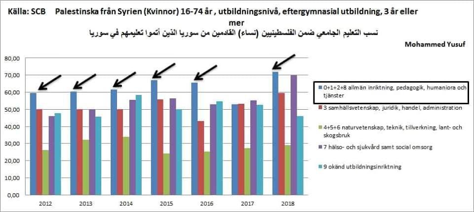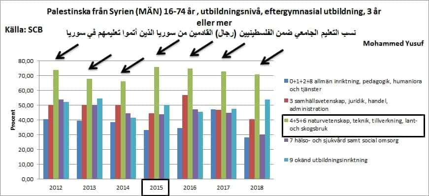 ذكر مكتب الإحصاء السويدي حول هجرة الأكاديميين الفلسطينين من سورية في السويد، أن نسبة 70 % في عام 2018 من الاختصاصات المهاجرة من الفلسطينيين السوريين هي اختصاصات علمية من إجمالي حملة الشهادات الجامعية، ضمن اختصاصات منها الهندسة و التقنيات و فروع علمية منها الفيزياء والرياضيات.