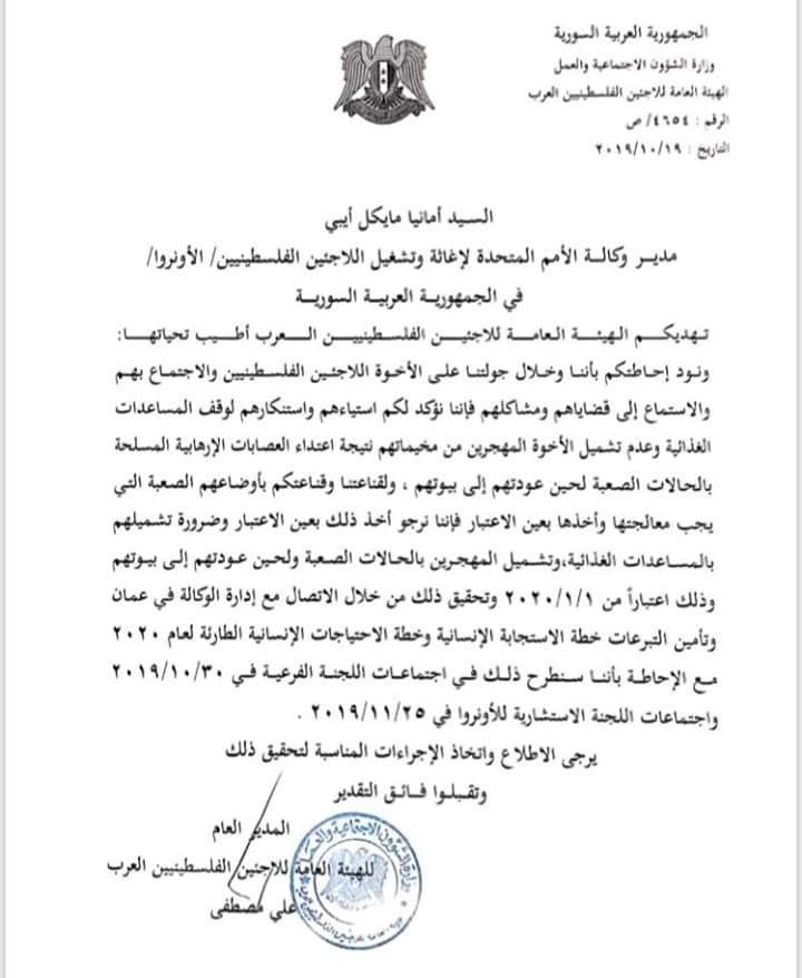 وقالت الهيئة في رسالة وجهتها لمدير عام وكالة غوث وتشغيل اللاجئين الفلسطينيين في سورية “أمانيا مايكل”، إن اللاجئين الفلسطينيين في سورية في حالة استياء واستنكار بسبب عدم تشميلهم ببرنامج مساعداتها الغذائية.
