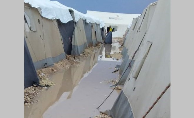 غرق خيام المهجرين الفلسطينيين في مخيم الصداقة شمال سورية