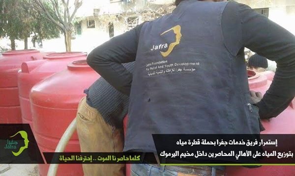 يواصل الفريق التطوعي في مؤسسة جفرا تقديم خدماته الإغاثية والخدمية لسكان مخيم اليرموك المحاصرين منذ حوالي 632 يوماً على التوالي، حيث يستمر فريق الخدمات في جفرا بحملة” قطرة مياه” وذلك لايصال المياه إلى منازل وبيوت المخيم ودور العبادة، وبهدف التخفيف من معاناة سكان المخيم الذين يشتكون من استمرار إنقطاع المياه عن منازلهم وحاراتهم منذ أكثر من سبعة أشهر ونصف.