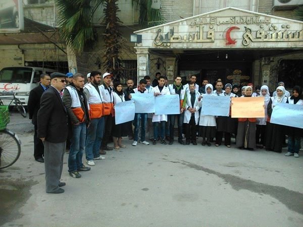 نفّذ عدد من كوادر ومتطوعي جمعية الهلال الأحمر الفلسطيني في مخيم اليرموك اليوم وقفة تضامنية، وذلك احتجاجاً على  استهداف الكوادر والطواقم الطبية في المخيم، كما عبروا عن ادانتهم لاغتيال الناشط الإغاثي والطبي” يحيى عبد الله الحوراني” الذي اغتيل بطلق ناري أثناء يوم أمس أثناء توجهه إلى مشفى فلسطين.