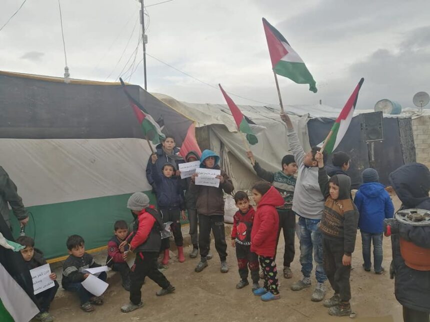 نظم عشرات اللاجئين الفلسطينيين في مخيم دير بلوط شمال سورية في وقفة احتجاجية ضد الخطة الأميركية لتصفية القضية الفلسطينية المسماة بـ”صفقة القرن”.