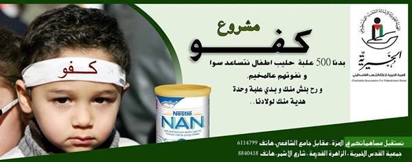 تحت شعار”كفو” أعلنت الهيئة الخيرية لإغاثة الشعب الفلسطيني اطلاق حملتها لجمع عبوات حليب لإدخالها إلى أطفال مخيم اليرموك المحاصرين منذ حوالي((634) يوماًعلى التوالي، والذين يعانون من نقص في جميع المواد الغذائية والأدوية والطبية.