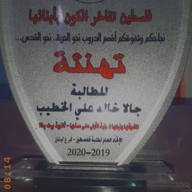 كرم الاتحاد العام لطلبة فلسطين – فرع لبنان ، الطالبة الفلسطينية السورية “جالا خالد الخطيب” لتفوقها الدراسي وحصولها على المرتبة الأولى على مستوى الصف الأول الثانوي في مدرسة بيت جالا التابعة للأونروا في منطقة سبلين بإقليم الخروب في لبنان جنوب لبنان.