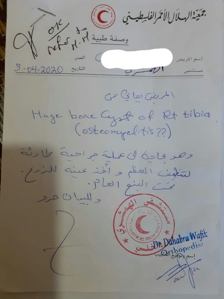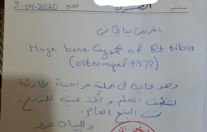 وقال الناشط “محمود الشهابي” إن وكالة الأونروا والسفارة الفلسطينية في لبنان ساهما بدورهما في تكاليف علاج المريض الفلسطيني شادي المقيم في مخيم عين الحلوة بلبنان، وبقي مليون ونصف لبناني- ما يقارب 500 $ من أجل إجراء العملية الجراحية لتنظيف العظم.