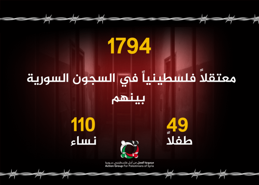أكد فريق الرصد والتوثيق في مجموعة العمل من أجل فلسطينيي سورية أن الإحصاءات الخاصة بالمعتقلين الفلسطينيين، والتي تم تحديثها مؤخراً وإضافة عدد من المعتقلين الجدد إليها، أشارت إلى وجود “1794” معتقلاً فلسطينياً في سجون النظام السوري ممن تمكنت المجموعة من توثيقهم.