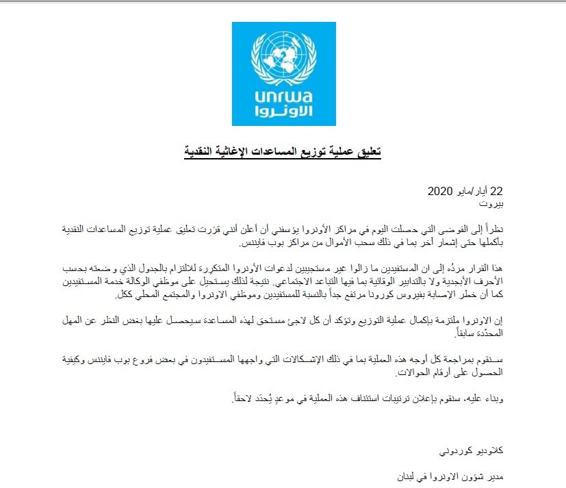 وقالت الأونروا في بيان أصدرته بهذا الخصوص على لسان مديرها في لبنان کلاودیو کوردولی “أنها ونظراً للفوضى التي حصلت اليوم في مراكز الأونروا يؤسفني أن أعلن أنني قررت تعليق عملية توزيع المساعدات النقدية بأكملها حتى إشعار آخر بما في ذلك سحب الأموال من مراكز بوب فايننس”.