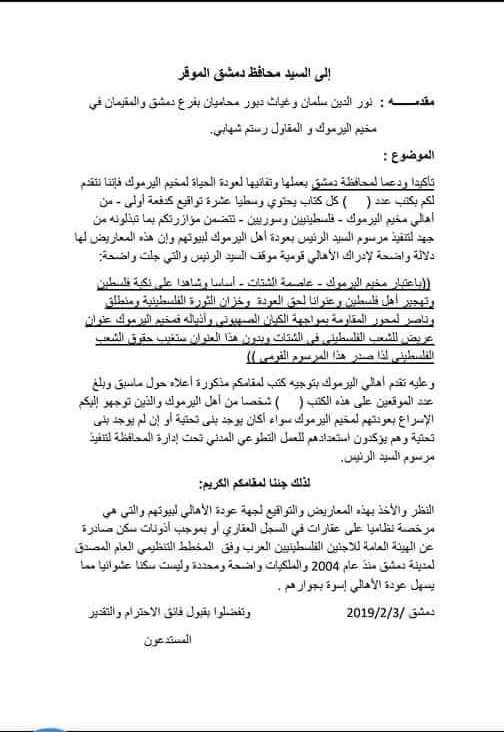 طالب عدد من الناشطين وأهالي مخيم اليرموك محافظ دمشق، بالرد على العريضة التي قدموها يوم 3 شباط/ فبراير من العام 2019 إلى تتضمن توقيع حوالي 3000 آلاف شخص من أبناء مخيم اليرموك بمجموع 200 صفحه مرقمه أصولاً، والمطالبة بعودتهم الفورية للمخيم سواء توفرت فيه البنى التحتية أو لم تتوفر، وذلك بعد أن أرهقتهم التكاليف المادية مؤكدين خلالها استعدادهم للعمل التطوعي المدني وأنهم سيقومون ببناء منازلهم بأيديهم ويعيدون المخيم إلى سابق عهده.