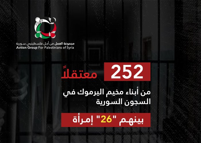 تشير الاحصائيات الموثقة لمجموعة العمل من أجل فلسطينيي سورية أن (252) لاجئاً فلسطينياً من أبناء مخيم اليرموك جنوب العاصمة السورية دمشق بينهم (227) رجلاً، و(25) امرأة مغيبون قسرياً في السجون السورية.
