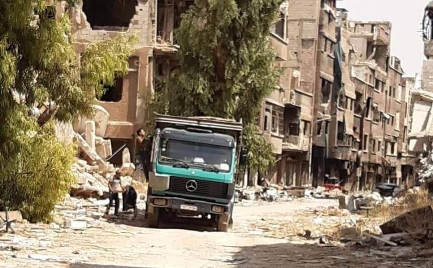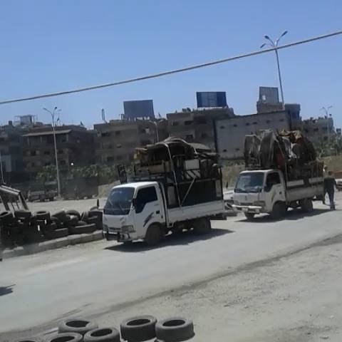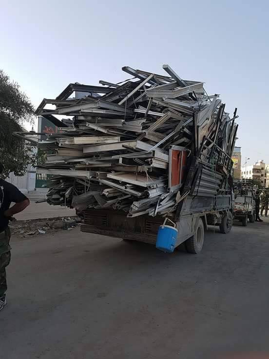 أظهرت صور نشرتها مواقع وصفحات التواصل الاجتماعي المعنية بنقل أخبار مخيم اليرموك صوراً لسيارات شحن كبيرة محملة بالأبواب والنوافذ وغرف النوم التي تم (تعفيشها) وسرقتها من منازل اللاجئين الفلسطينيين في مخيم اليرموك.