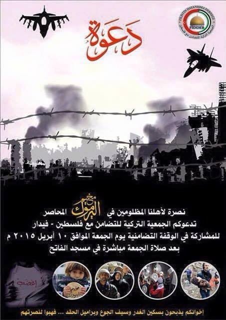 دعت الجمعية التركية للتضامن مع فلسطين – فيدار – إلى وقفة تضامنية مع مخيم اليرموك المحاصر يوم الجمعة (10/نيسان/2015م) بعد صلاة الجمعة مباشرة أمام مسجد الفاتح بمدينة اسطنبول .