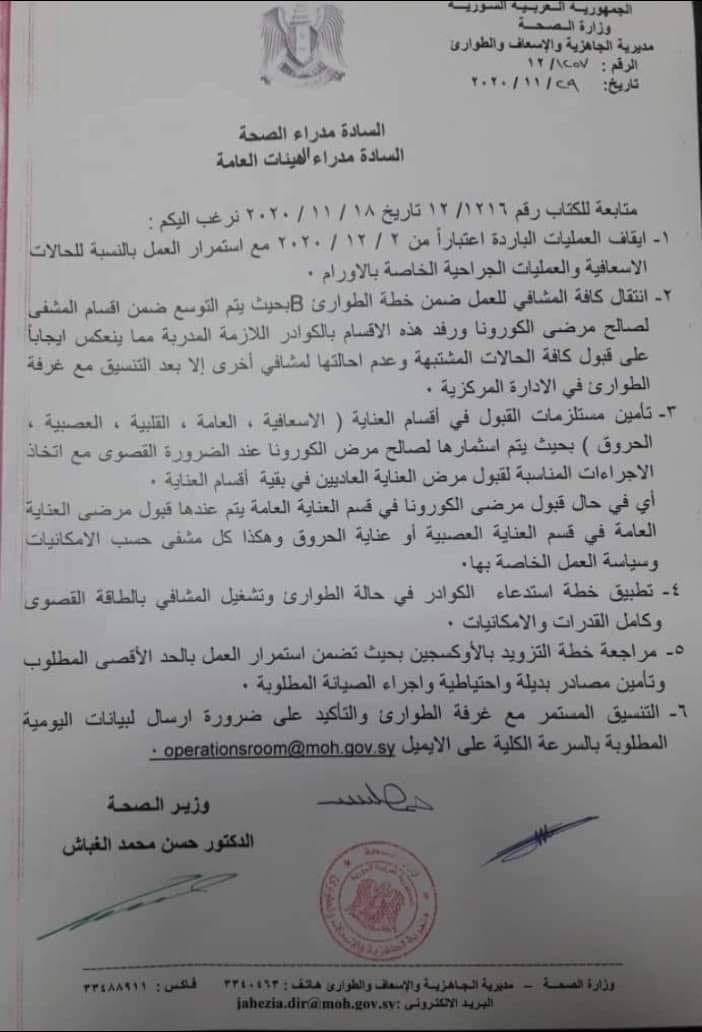 وشددت وزارة الصحة في كتابها على ضرورة انتقال كل المشافي للعمل ضمن خطة الطوارئ (B) بحيث يتم التوسع ضمن أقسام المشفى لمصلحة مرضى كورونا ورفد هذه الأقسام بالكوادر اللازمة المدربة بما ينعكس إيجاباً على قبول كل الحالات المشتبهة وعدم إحالتها لمشاف أخرى إلا بعد التنسيق مع غرفة الطوارئ بالإدارة المركزية.