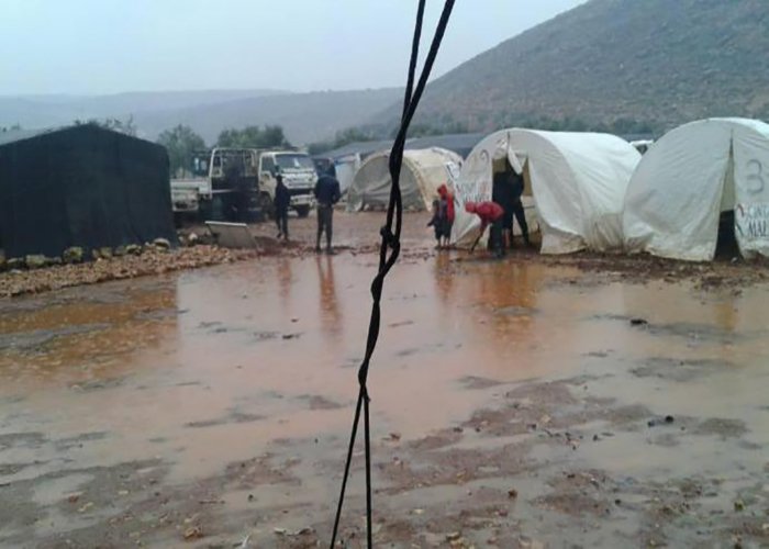 ففي مخيمي دير بلوط والمحمدية حولت الأمطار الغزيرة المنهمرة على المنطقة خيم اللاجئين إلى مستنقعات، كما اقتلعت الرياح الشديدة بعض خيامهم، مما ضاعف من معاناتهم ومأساتهم.