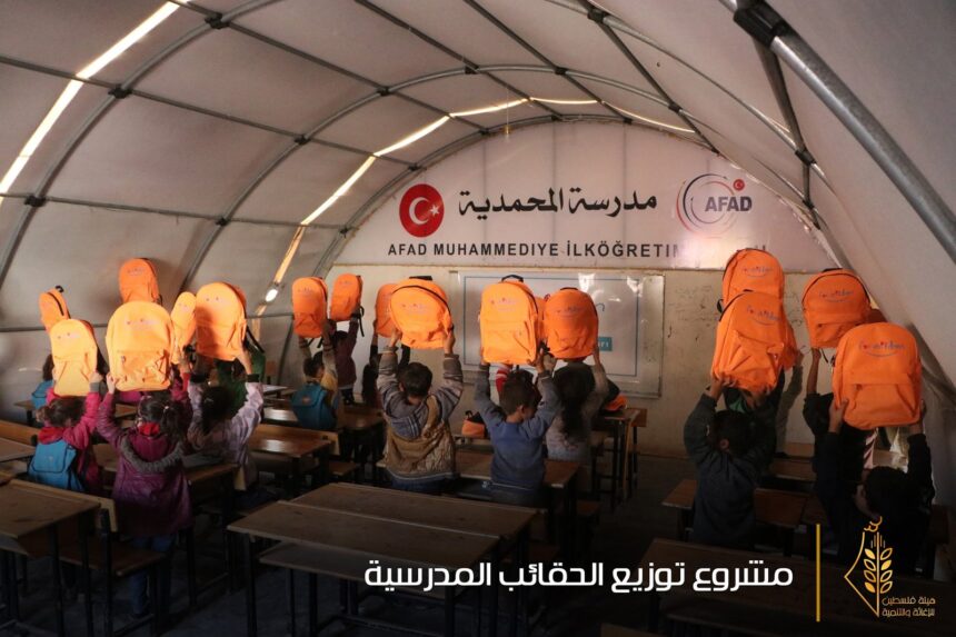 وزعت هيئة “فلسطين للإغاثة و التنمية” حقائب مدرسية على الطلاب في مخيمي دير بلوط والمحمدية، وعدد من مخيمات اللاجئين شمال سورية، تضمنت أكثر من (1600) حقيبة مدرسية قرطاسية كاملة من دفاتر وأقلام وأدوات هندسية.