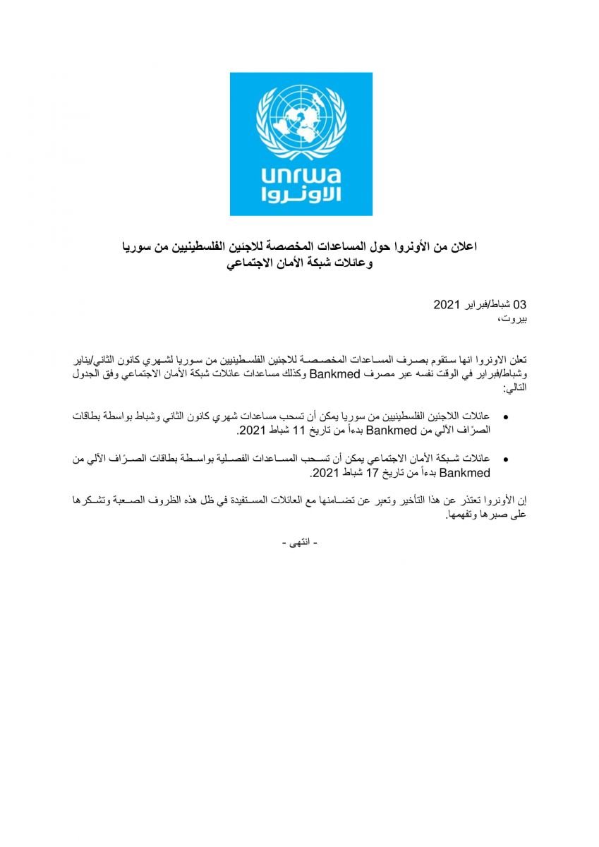 وأشارت وكالة الغوث إلى أن بإمكان عائلات اللاجئين الفلسطينيين من سوريا سحب مساعدات شهري كانون الثاني وشباط بواسطة بطاقات الصرًاف الآلي من Bankmed بدءاً من تاريخ 11 شباط 2021.