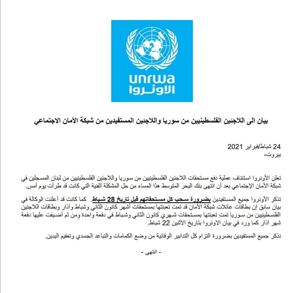 وكانت وكالة الغوث أوقفت ظهر يوم أمس الأربعاء توزيع مساعداتها النقدية لفلسطينيي سورية في لبنان بسبب وقوع خطأ تقني في بنك البحر المتوسط في لبنان، أدى إلى تعبئة زيادة في المبالغ المالية التي حولتها الأونروا لمستحقيها.
