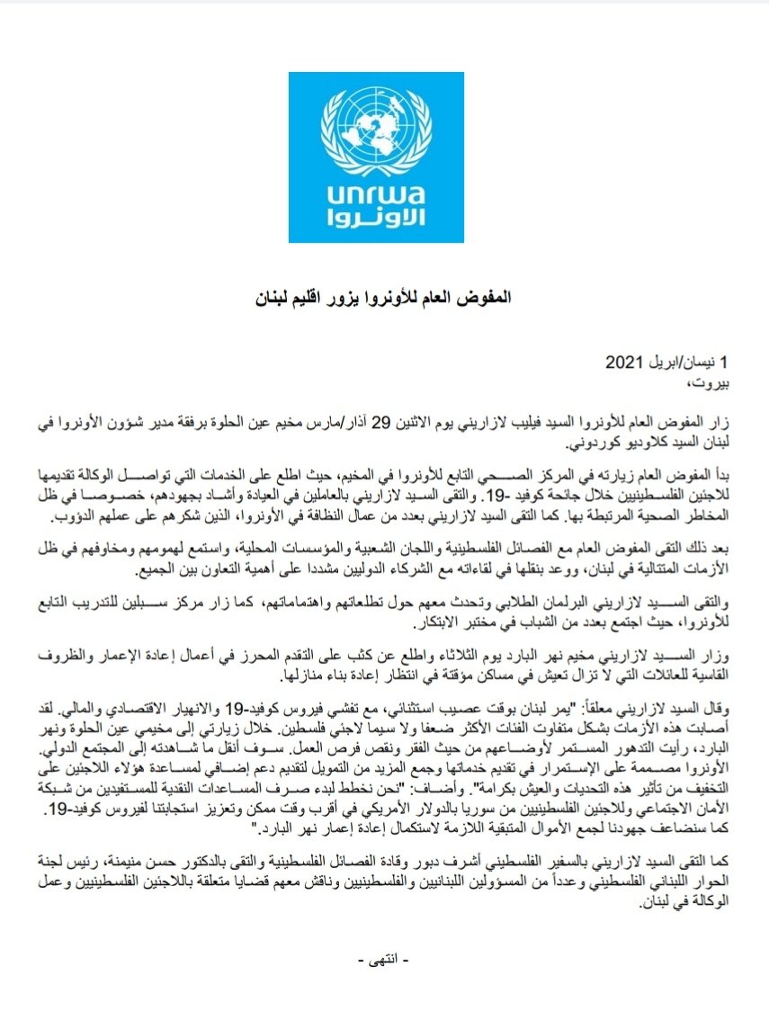 وقال لازاريني خلال زيارته إلى مخيم عين الحلوة بمدينة صيدا جنوب لبنان، يوم 29 أذار/ مارس المنصرم، إن الأونروا تخطط لبدء صرف المساعدات النقدية المقدمة للمستفيدين من شبكة الأمان الاجتماعي وللاجئين الفلسطينيين من سورية بالدولار الأمريكي في أقرب وقت ممكن، وتعزيز استجابتنا لفيروس كوفيد 19.