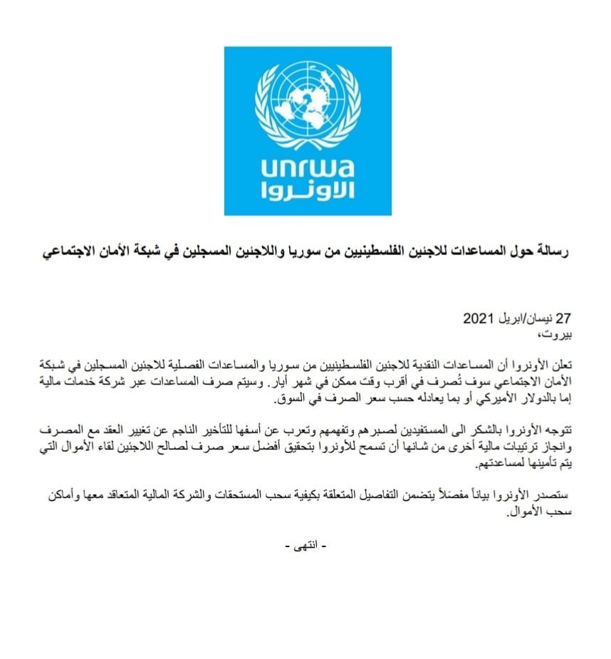 وعدت وكالة الأونروا في لبنان في رسالة وجهتها يوم أمس الثلاثاء حول المساعدات النقدية المقدمة للاجئين الفلسطينيين من سوريا واللاجئين الفلسطينيين في شبكة الامان الاجتماعي، بصرف مساعداتها بأقرب وقت ممكن من شهر أيار، منوهة إلى أنها ستقوم بصرف تلك المساعدات إما بالدولار أو ما يعادله حسب سعر الصرف في السوق.