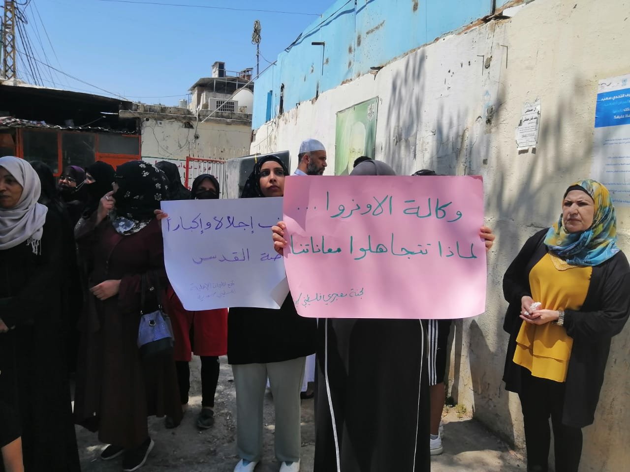 رفع المحتجون لافتات تعبِّر عن غضبهم، بسبب الإهمال والاستهتار الذي تمارسه الأونروا بحقهم، مشددين على أن المساعدات التي يتلقونها ليست تسوّلاً بل هي احدى التزامات الأونروا بصفتها المسؤولة عنهم.