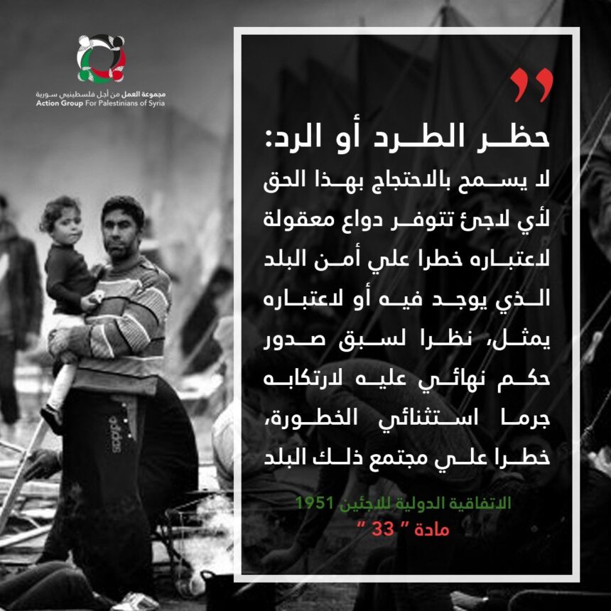 1. لا يجوز لأية دولة متعاقدة أن تطرد لاجئا أو ترده بأية صورة من الصور إلي حدود الأقاليم التي تكون حياته أو حريته مهددتين فيها بسبب عرقه أو دينه أو جنسيته أو انتمائه إلي فئة اجتماعية معينة أو بسبب آرائه السياسية.