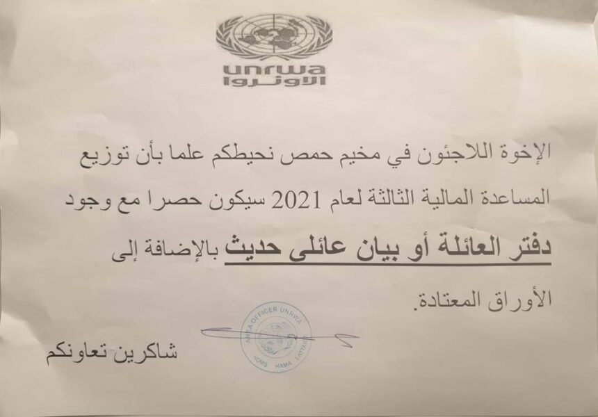 طالب مكتب الأونروا في مخيم العائدين بحمص اللاجئين الفلسطينيين بإبراز دفتر العائلة أو بيان عائلي حديث لاستلام المساعدة المالية، مشدداً على أهمية إبراز هذه الأوراق لاستلام المساعدة.