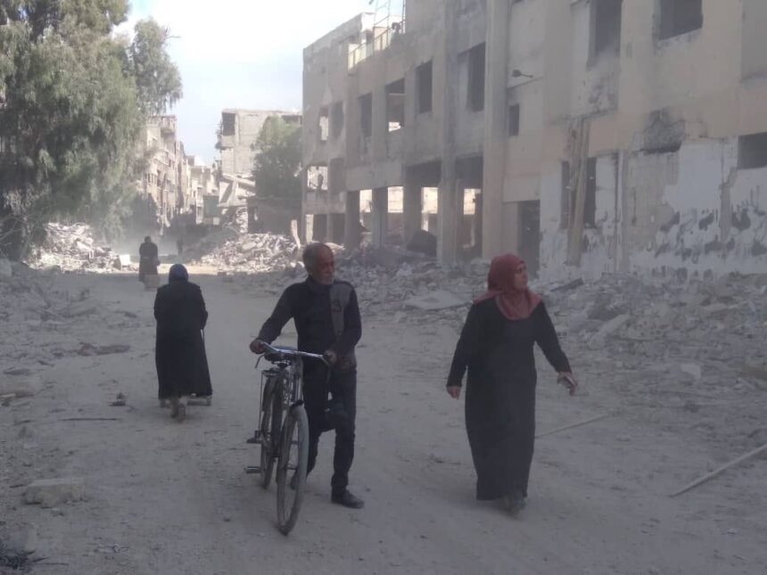 وتشير “لجنة إزالة الأنقاض في مخيم اليرموك” إلى إنجاز 90% من مشروع إزالة الركام والأنقاض في شارعي اليرموك وفلسطين والمرحلة القادمة ستشمل منطقتي حي التقدم و8 آذار، وأن عودة الأهالي كانت خجولة وبطيئة بسبب عدم وجود خدمات وبنى تحتية والركام.