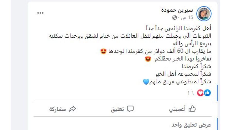 الجدير بالتنويه أن جمعيات وأفراداً فلسطينيين كانوا في صدارة الأكثر تبرعاً في الحملة التي أطلقها فريق ملهم التطوعي، والتي نجحت بجمع أكثر من مليوني دولار لإيواء النازحين ونقلهم من الخيام إلى شقق سكنية.