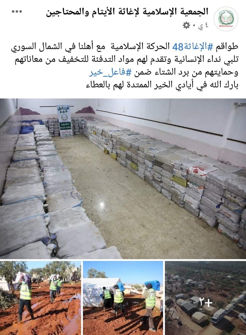 وضمن مشروع الاستجابة العاجلة لمواجهة فيروس كورونا قامت طواقم جمعية الإغاثة 48، وبدعم من أهل الخير داخل الأراضي المحتلة عام 1948، بتوفير عدد من المستلزمات الطبية وإرسالها للاجئين الفلسطينيين المهجّرين في الشمال السوري، إضافة إلى مشاريع وحملات إغاثية عديدة قامت بها كمشروع “رغيف الخبز وحملة “فاعل خير” التي أطلقتها الجمعية بالتزامن مع موسم الشتاء”.