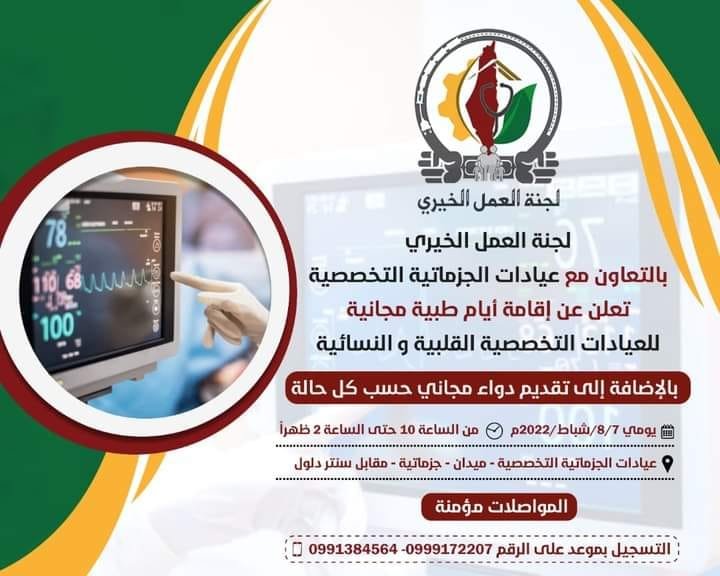 أعلنت لجنة العمل الخيري التابعة لحركة الجهاد الا سلامي بالتعاون مع عيادات الجزماتية التخصصية، عن إقامة أيام طبية مجانية للعيادات التخصصية القلبية والنسائية، لأهالي مخيم خان الشيح للاجئين الفلسطينيين بريف دمشق الغربي، وذلك يومي 7 و8 شباط/ فبراير الجاري، من الساعة 10 صباحاً وحتى 2 ظهراً.