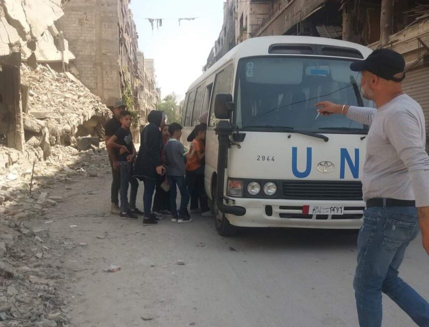 باشرت حافلات تابعة لوكالة غوث وتشغيل اللاجئين الفلسطينيين “أونروا” مع أول أيام العام الدراسي الجديد بنقل الطلاب من داخل مخيم اليرموك إلى مدارسها في منطقة الزاهرة.