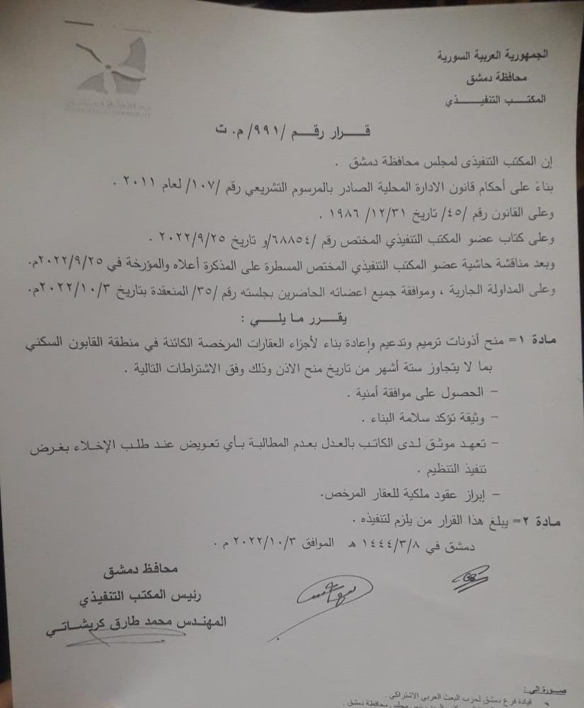وكانت محافظة دمشق قد أصدرت قراراً في 03-10-2022 يمنح أذونات ترميم وتدعيم وإعادة بناء لأجزاء العقارات المرخصة في منطقة القابون السكني بما لا يتجاوز ستة أشهر من تاريخ منح الاذن بعد تحقيق شروط أوضحها القرار وهي: الحصول على موافقة أمنية، وثيقة تؤكد سلامة البناء، تعهد موثق لدى الكاتب بالعدل بعدم المطالبة بأي تعويض عند طلب الإخلاء بغرض التنظيم، إبراز عقود ملكية للعقار المرخص.