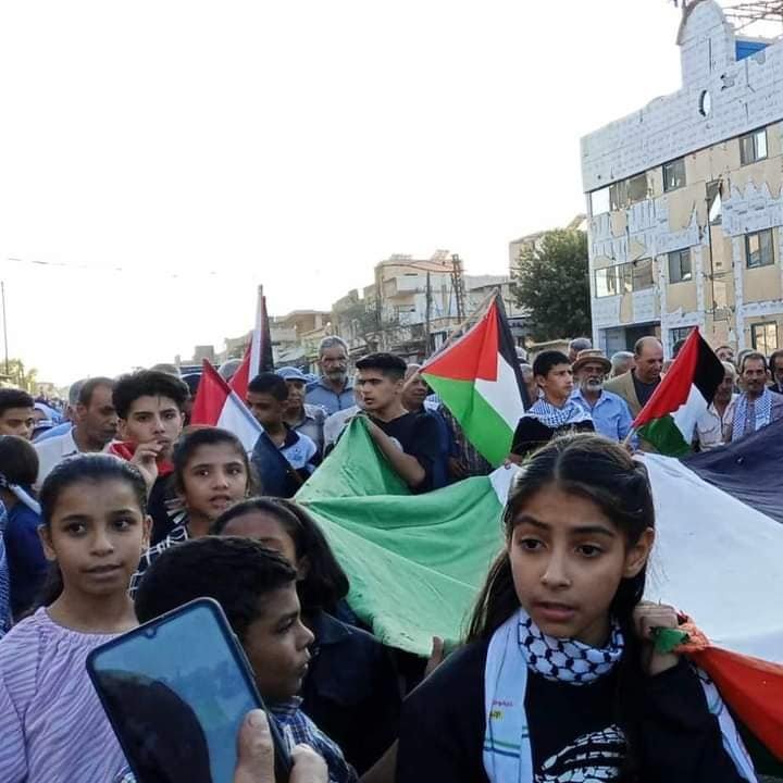نظّم أهالي مخيم خان الشيح للاجئين الفلسطينيين بريف دمشق، مسيرة ووقفة تضامنية مع أهلهم في غزة الذين يتعرضون لأبشع حرب إبادة من جانب قوات الاحتلال الإسرائيلي.