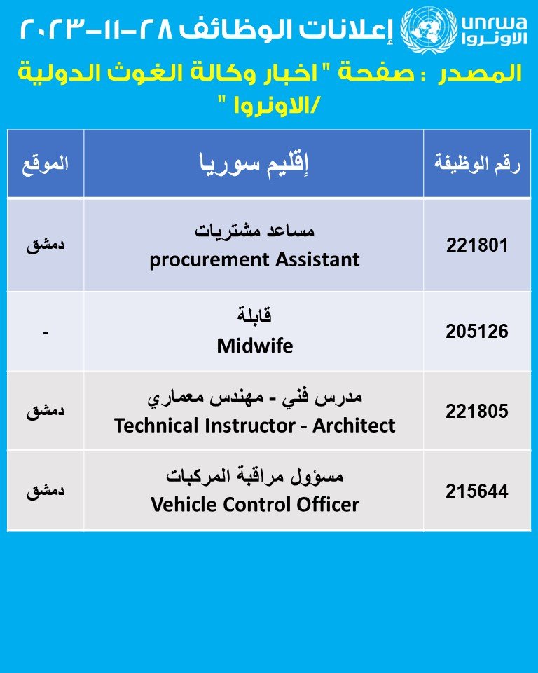 أعلنت وكالة الأمم المتحدة لإغاثة وتشغيل اللاجئين الفلسطينيين في الشرق الأدنى – الأونروا في سورية اليوم 28 تشرين الثاني/ نوفمبر عن توفر وظائف شاغرة بعقد مثبت (Fixed Term) في الاختصاصات التالية، مساعد مشتريات، قابلة قانونية، مدرس فني، مهندس معماري، ومسؤول مراقبة المركبات بمدينة دمشق.