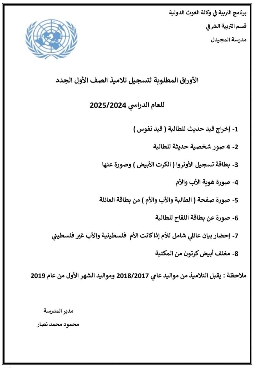 وطالبت “الأونروا”، أولياء الأمور بتجهيز الوثائق المطلوبة لتسجيل الطلبة، مشيرة إلى أن الطالب يجب أن يكون مسجلاً في بطاقة الوكالة للأب أو أن تكون أمه لاجئة مسجلة، مع إحضار الوثائق التالية عند التسجيل: اخراج قيد حديث للطلبة (قيد نفوس)،  أربع صور شخصيه حديثه للطلبة،  بطاقة تسجيل الأونروا (الكرت الأبيض) وصوره عنها، صوره هويه الأب والأم،  صوره صفحه (الطالبة والأب والأم) من بطاقة العائلة، صوره عن بطاقة اللقاح للطالبة، احضار بيان عائلي شامل للأم إذا كانت الأم فلسطينية والأب غير فلسطيني،  مغلف أبيض كرتون من المكتبة