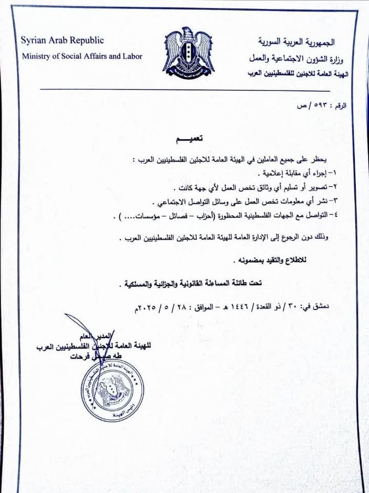 أصدرت الهيئة العامة للاجئين الفلسطينيين العرب في سوريا، التابعة لوزارة الشؤون الاجتماعية والعمل، تعميمًا إدارياً يُحظر بموجبه على جميع العاملين فيها القيام بعدة إجراءات دون الرجوع إلى الإدارة العامة، في خطوة تهدف إلى تشديد الرقابة على المعلومات والاتصالات المتعلقة بالعمل.