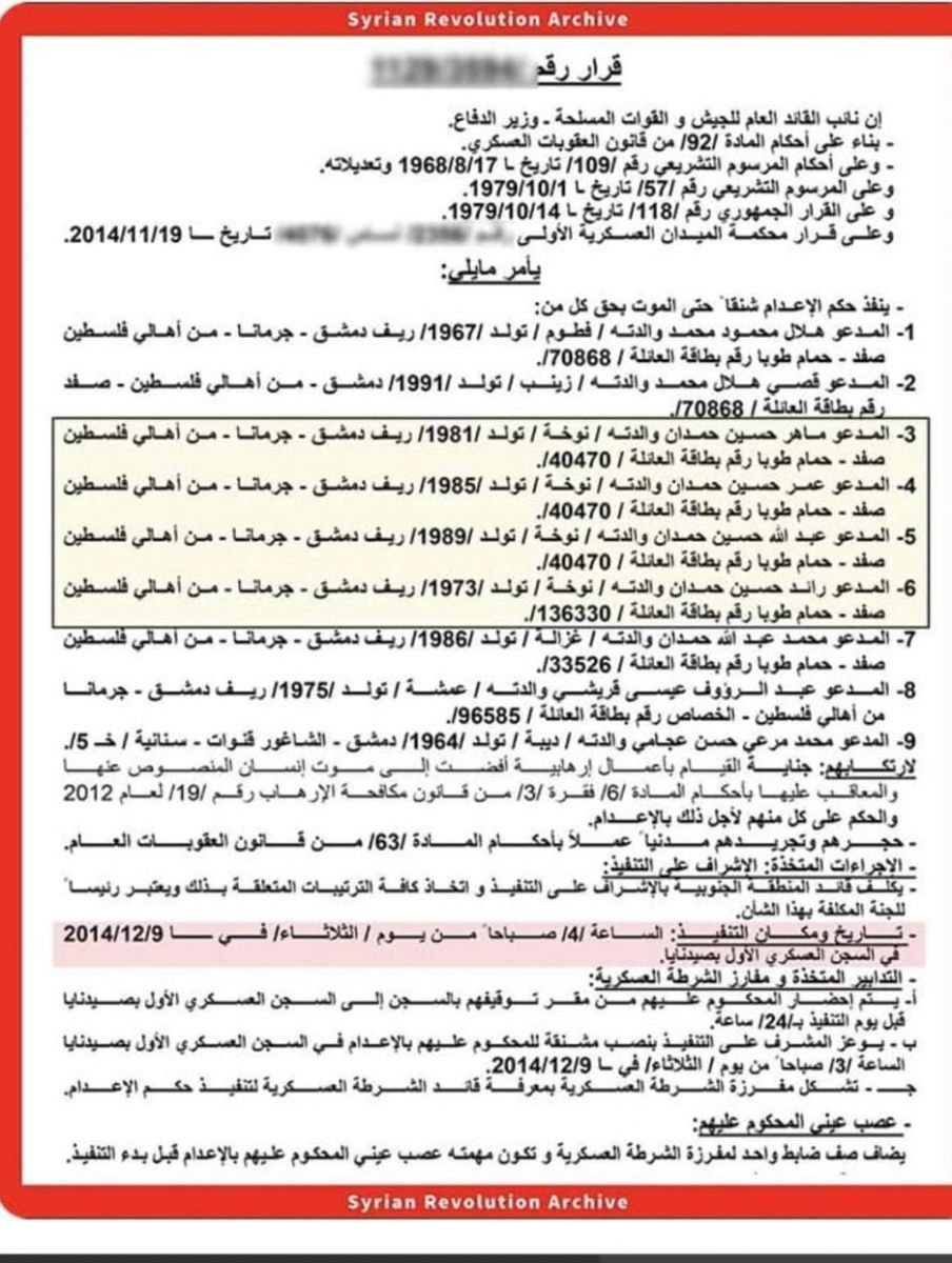 كشفت وثيقة رسمية صادرة عن المحكمة الميدانية العسكرية الأولى التابعة للنظام السوري السابق، مؤرخة بتاريخ 19 تشرين الثاني/نوفمبر 2014، عن تنفيذ حكم الإعدام بحق ثمانية فلسطينيين وسوري واحد من سكان دمشق ومخيم جرمانا بريفها.
