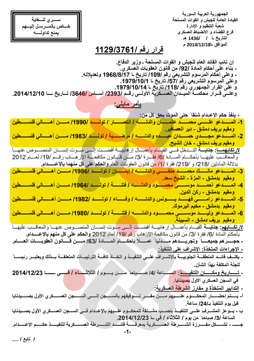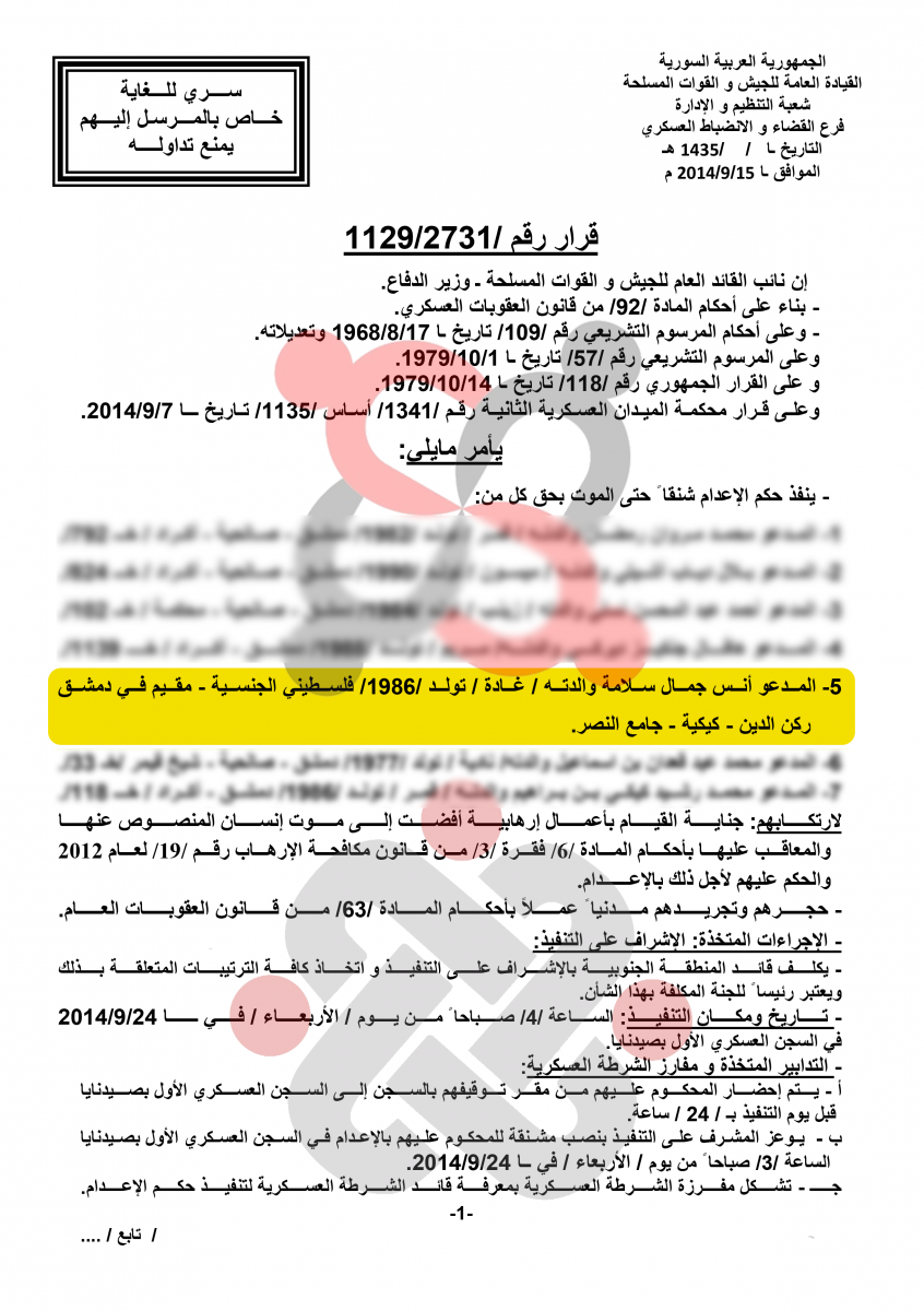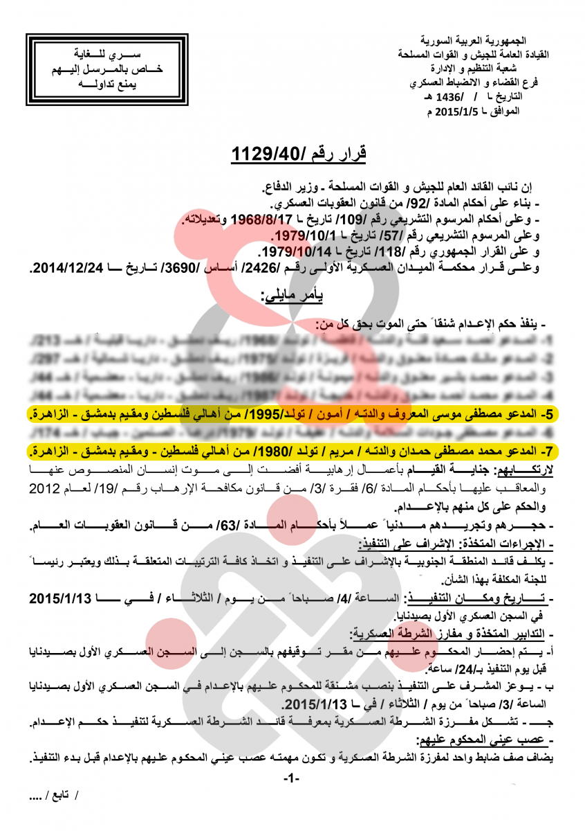 وأظهرت الوثائق، المستمدة من أرشيف الثورة السورية، أسماء الضحايا الذين أُعدموا دون محاكمات عادلة أو إخطار لعائلاتهم، وهم: