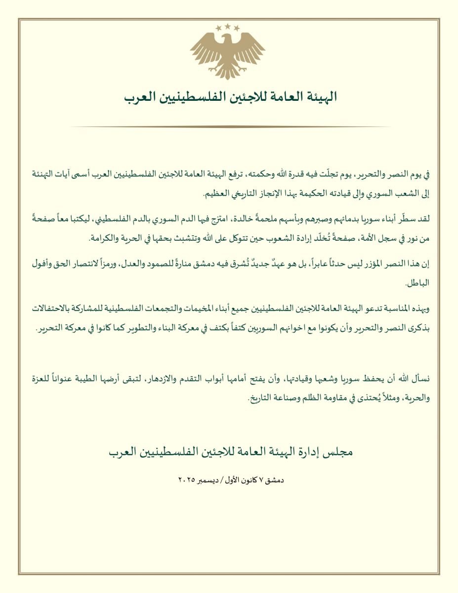 أصدرت الهيئة العامة للاجئين الفلسطينيين العرب بياناً رسمياً بمناسبة “يوم النصر والتحرير”، واصفة إياه بـ “الإنجاز التاريخي العظيم” الذي سطّره الشعب السوري بدمائه وصبره، حيث “امتزج الدم السوري بالفلسطيني” في ملحمة خالدة تخلّد إرادة الشعوب الحرة.