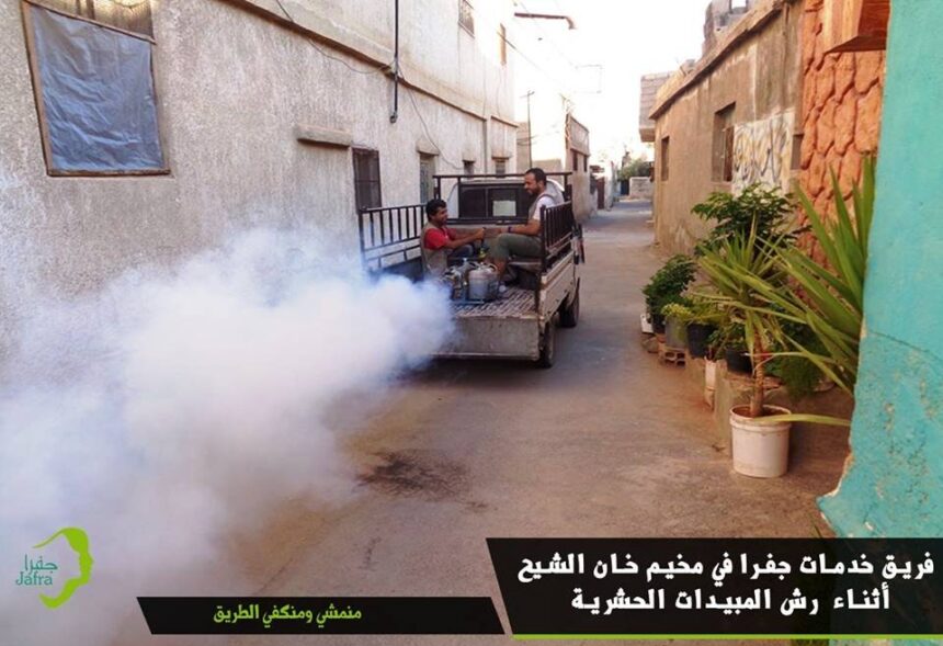 تستمر مؤسسة جفرا للإغاثة والتنمية في مخيم خان الشيح للاجئين الفلسطينيين بريف دمشق بتقديم خدماتها لأهالي المخيم، حيث قام فريق الخدمات في المؤسسة بحملة لرش المبيدات الحشرية في شوارع المخيم لمكافحة الحشرات التي تنقل الأمراض وتنتشر في فصل الصيف.