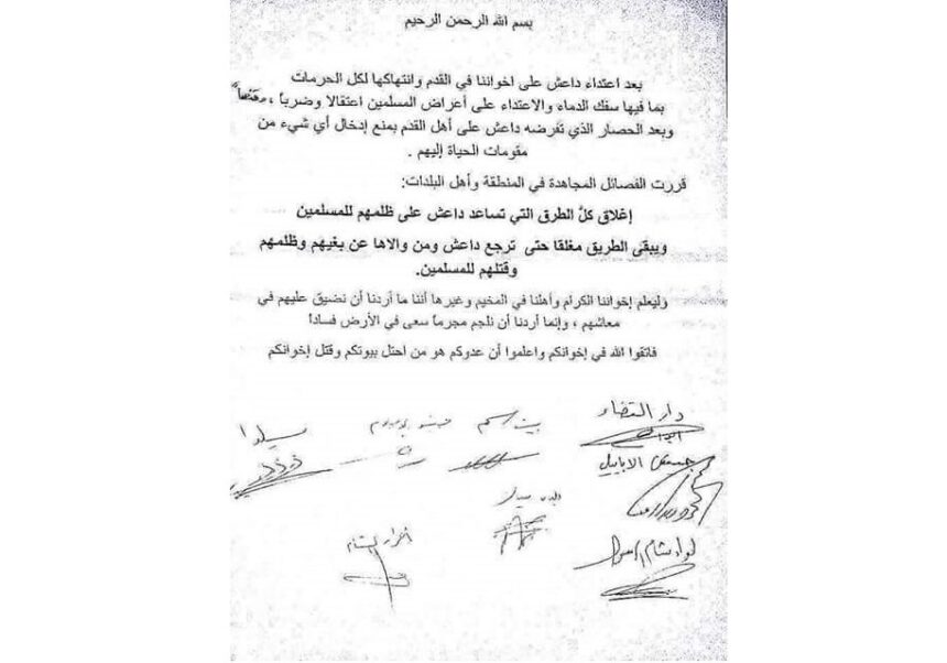 أصدرت عدد من مجموعات المعارضة السورية المسلحة، المتواجدة في بلدة يلدا المجاورة للمخيم اليرموك، بياناً أعلنت فيه إغلاق طريق (يلدا- مخيم اليرموك)، وذلك لمعاقبة تظيم الدولة – داعش على اقتحامه لحي القدم وذلك بحسب البيان.