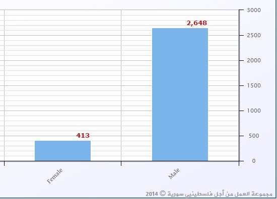 أكد فريق الرصد والاحصاء في مجموعة العمل من أجل فلسطينيي سورية أن حوالي (8%) من الضحايا الفلسطينيين الذين تم توثيقهم في سورية هم من الإناث.