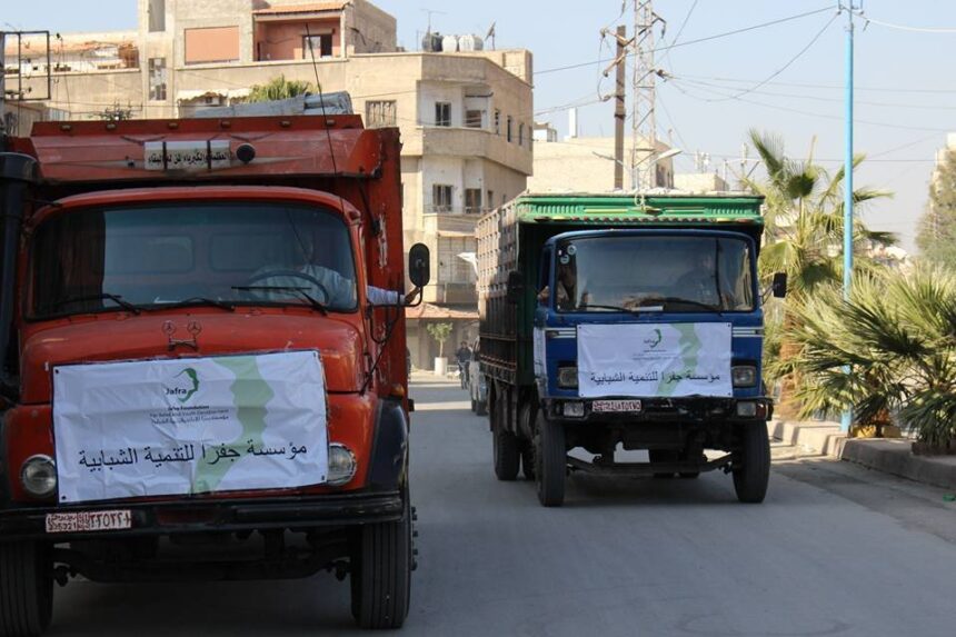 أعلنت مؤسسة جفرا للإغاثة والتنمية عبر صفحتها على موقع التواصل الاجتماعي فيسبوك عزمها على توزيع (1000) حصة غذائية على العائلات الفلسطينية النازحة من مخيم اليرموك إلى بلدتي يلدا وببيلا المجاورتين.