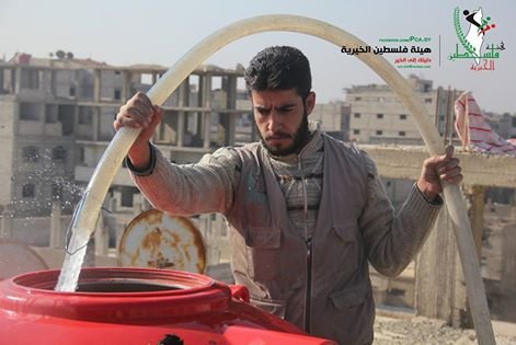 هيئة فلسطين الخيرية تستمر بتقديم مياه الشرب لأهالي اليرموك النازحين إلى البلدات المجاورة للمخيم
